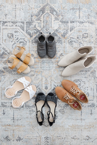 In warmer months I love bare feet where appropriate. Otherwise, cute leather sandals or sneakers look great.